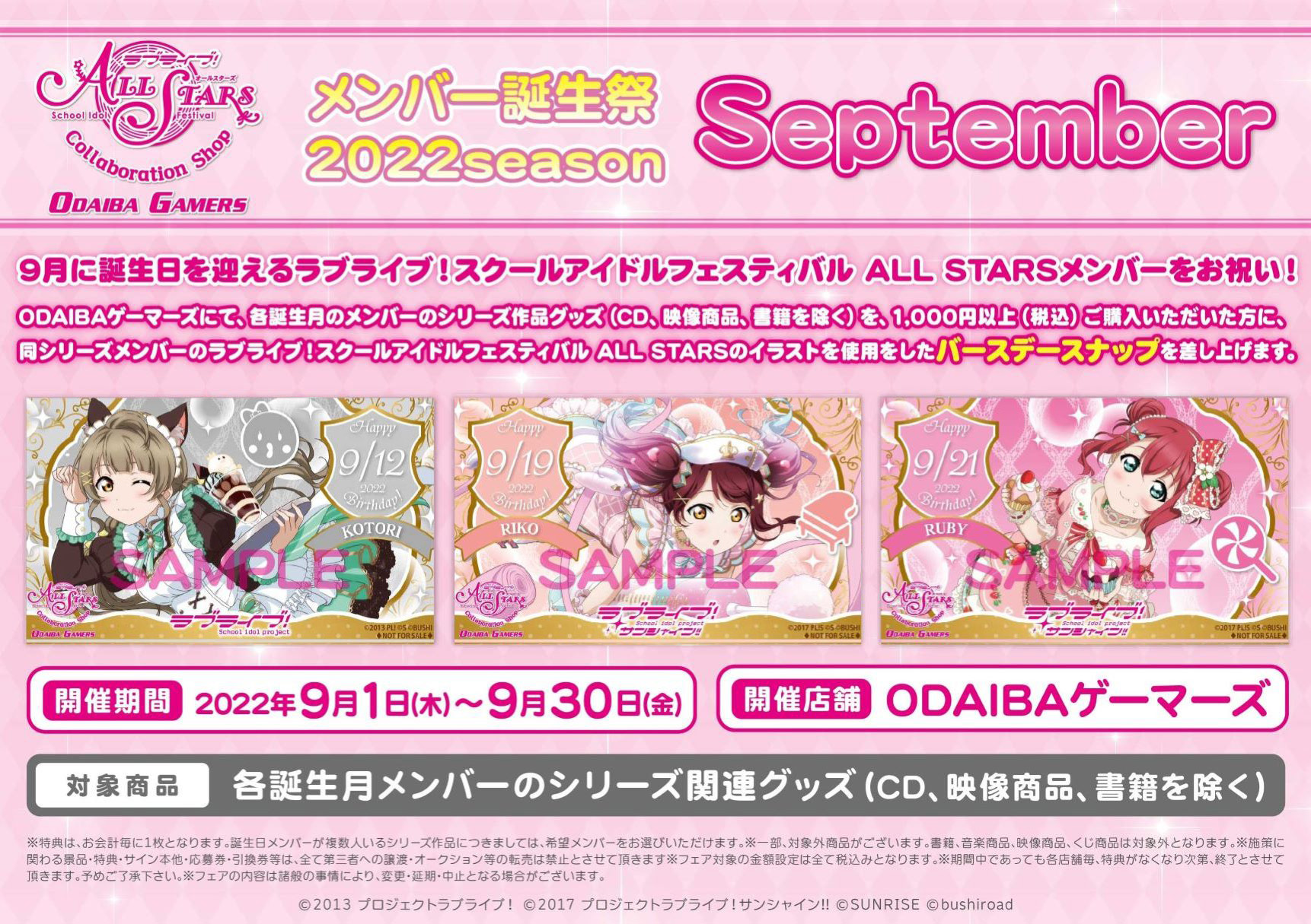 下記期間でバースデー記念ドリンクメニューの販売、記念ドリンク購入者様への特典ブロマイドお渡し、メッセージボードの展示をいたします。
