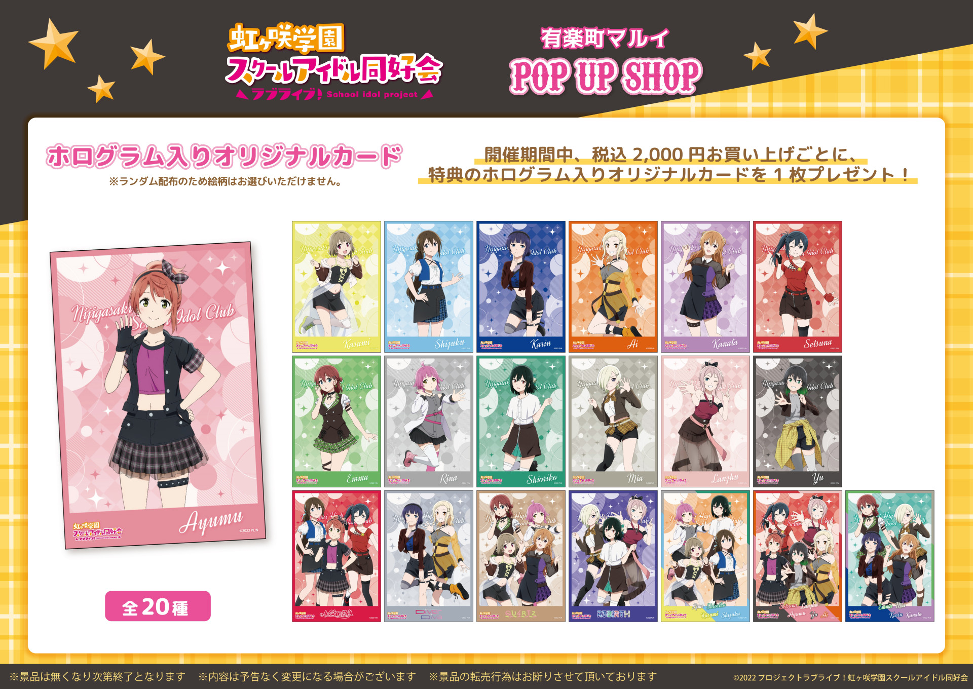 期間中、「ラブライブ!虹ヶ咲学園スクールアイドル同好会 POP UP SHOP」にて、税込2,000円お買い上げごとに、ホログラム入りオリジナルカードを1枚プレゼントいたします。