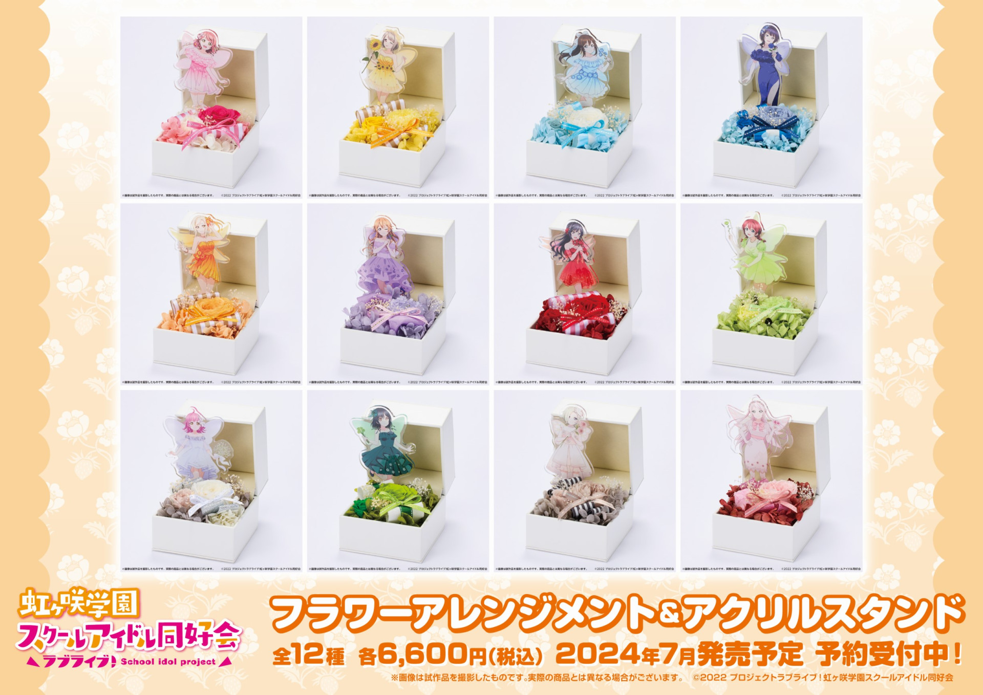 虹ヶ咲のメンバーそれぞれをイメージしたフラワーアレンジメントと、お花の妖精をイメージした華やかでかわいらしい衣装に身を包んだメンバーのアクリルスタンドがセットになった商品です。