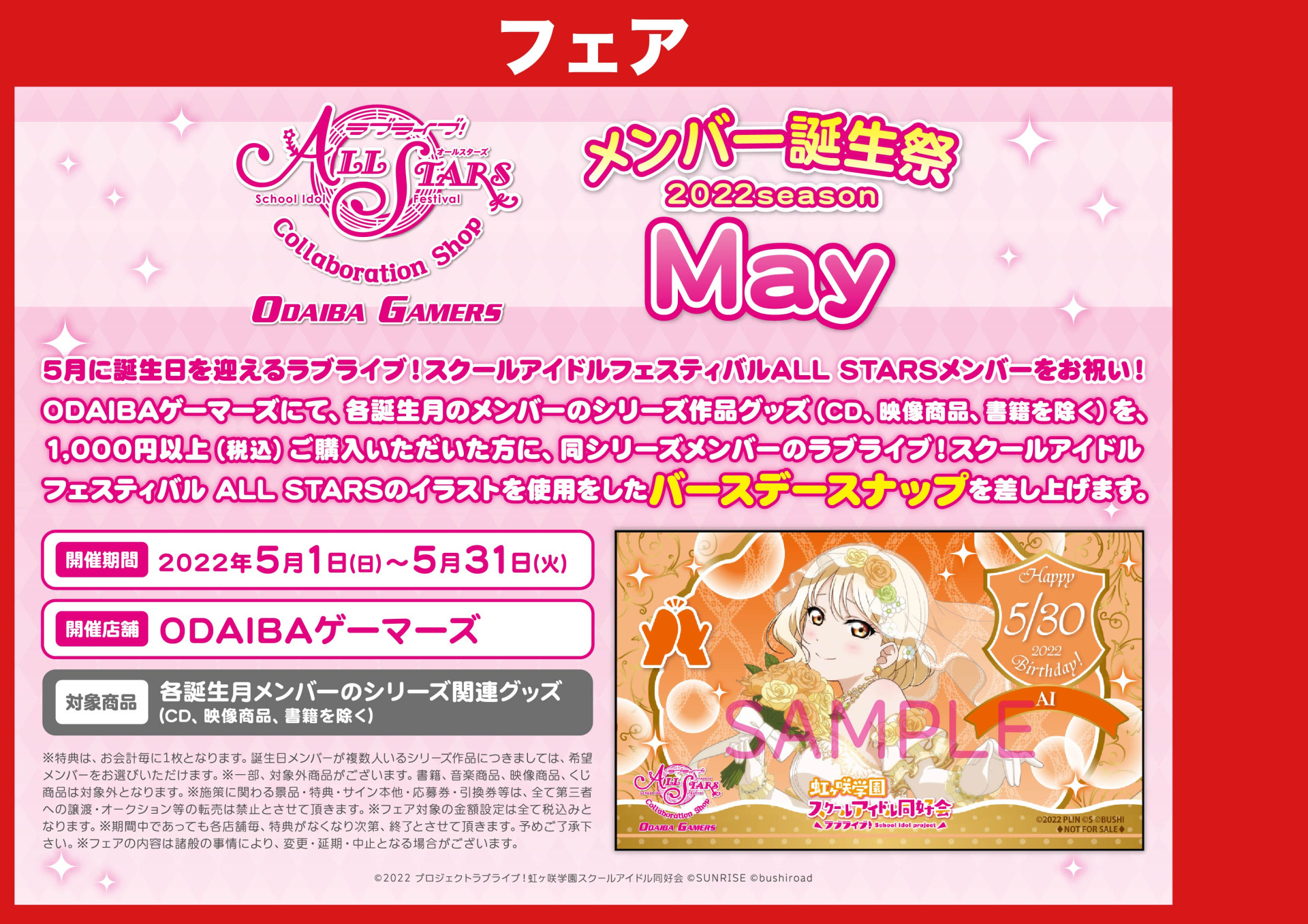 期間中、ODAIBAゲーマーズにて、各誕生月のメンバーのシリーズ作品グッズ(CD、映像商品、書籍を除く)を、1,000円以上(税込)ご購入いただいた方に同シリーズメンバーのラブライブ!スクールアイドルフェスティバル ALL STARSのイラストを使用したバースデースナップを差し上げます。