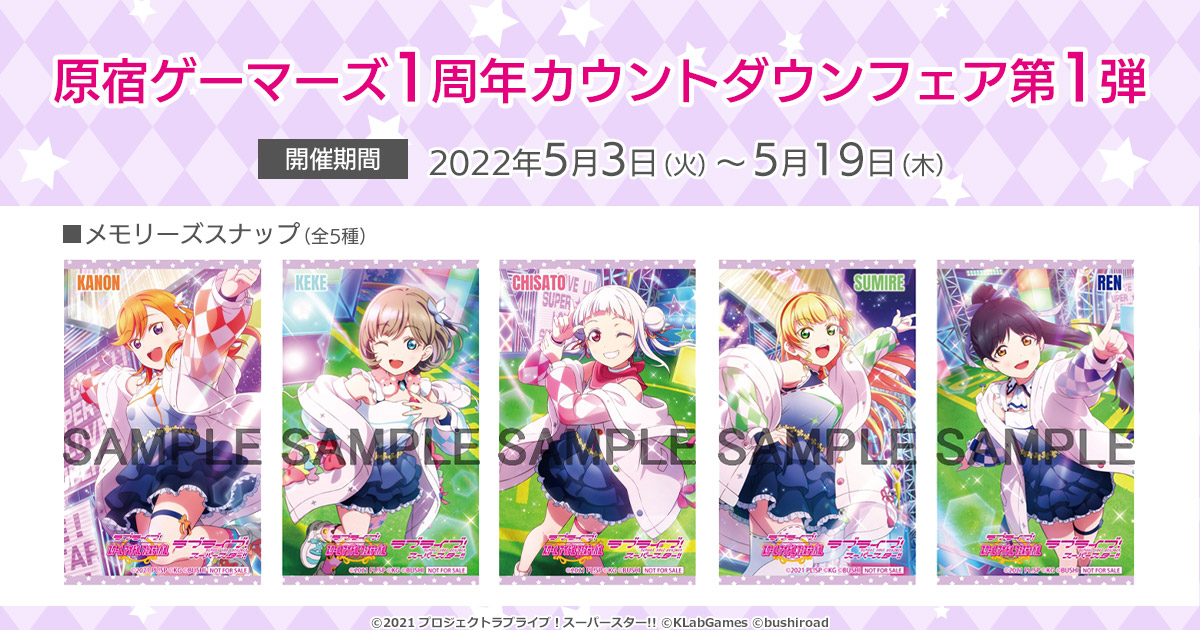 期間中、原宿ゲーマーズでラブライブ!スーパースター!!関連グッズ(映像、音楽商品、書籍を除く)、ご購入1,000円(税込)ごとに、ご挨拶カード(全9種)をランダムで1枚差し上げます。