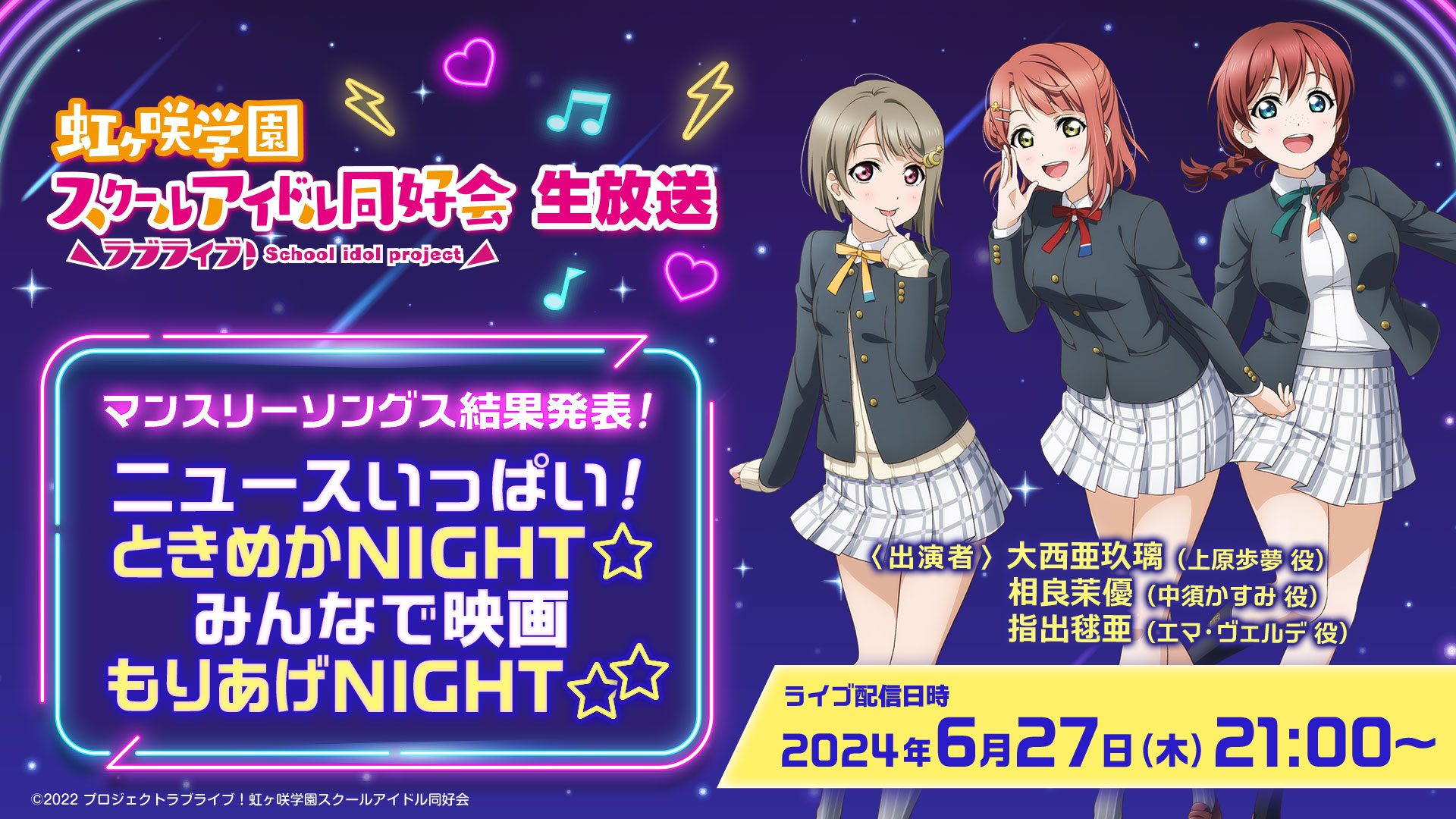 「ラブライブ!虹ヶ咲学園スクールアイドル同好会生放送 マンスリーソングス結果発表!ニュースいっぱい!ときめかNIGHT☆ みんなで映画もりあげNIGHT☆☆」のお知らせ!