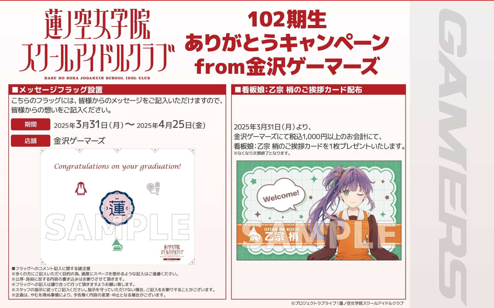 「ラブライブ!蓮ノ空女学院スクールアイドルクラブ」オフィシャルタイアップショップ金沢ゲーマーズより、102期生ありがとうキャンペーンfrom金沢ゲーマーズ実施のお知らせ